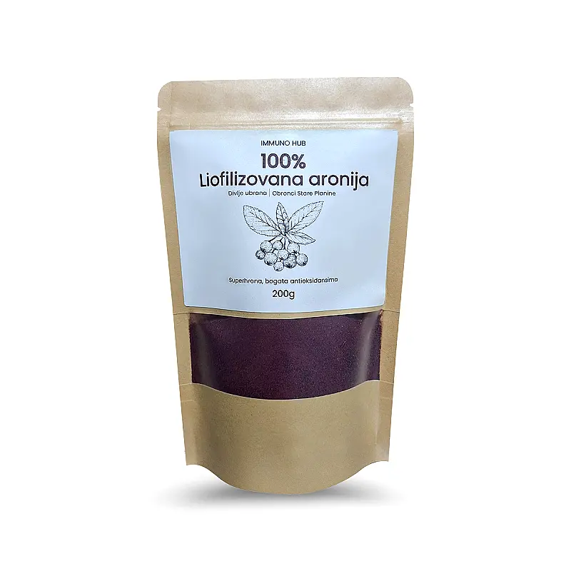 Naša liofilizirana aronija je vrhunski prirodni superhranjivi proizvod, dobijen pažljivim procesom liofilizacije koji čuva gotovo sve vitamine i minerale iz svežeg ploda. Samo 200 g liofilizirane aronije zamenjuje čak 1 kg sveže, što znači da dobijaš intenzivan nutritivni efekat u kompaktnom obliku.